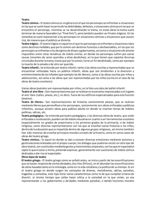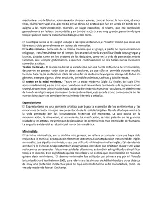El documento describe diferentes tipos de teatro como el cómico, trágico, infantil, al aire libre, de títeres, pedagógico y mímico. También describe el teatro griego y romano, el teatro medieval y el teatro en la edad moderna. Por último, define el expresionismo como una corriente que busca expresar emociones más que representar la realidad objetiva, y el minimalismo como una tendencia a reducir las cosas a lo esencial.