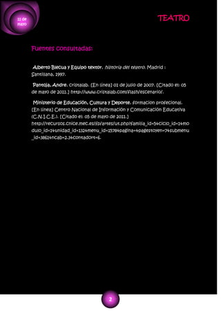 El documento presenta preguntas generadoras sobre conceptos teatrales como el público como actante, el teatro experimental, el escenario, el texto secundario y el texto general. Define al público como participante activo en algunas obras teatrales. Explica que el teatro experimental busca nuevas formas que incluyen la interacción con el público. Define el escenario como el lugar donde se compone el contenido visual de una obra y el texto secundario como aquel que complementa la exposición principal de una obra.
