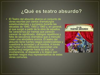 El teatro del absurdo surgió en las décadas de 1940 a 1960 y se caracteriza por obras sin tramas lógicas o significado claro, con diálogos repetitivos y falta de secuencia dramática. Cuestiona la sociedad y al hombre a través del humor y la mitificación. Dramaturgos como Beckett, Ionesco y Genet definieron este movimiento teatral que buscaba romper con convenciones aristotélicas y presentar una visión imaginativa de la vida más que imitarla.