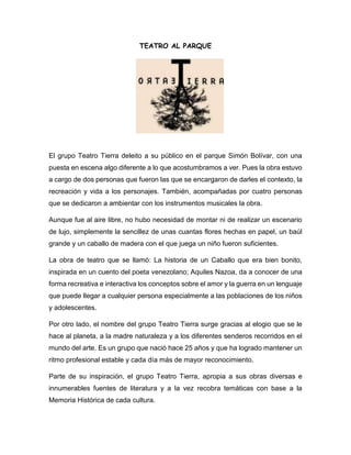El grupo Teatro Tierra presentó la obra 'La historia de un caballo que era bien bonito' en el Parque Simón Bolívar, utilizando una escenificación sencilla y elementos interactivos para transmitir temas de amor y guerra. La producción, que contó con un elenco reducido y música en vivo, está inspirada en un cuento del poeta venezolano Aquiles Nazoa y busca conectar con niños y adolescentes. Con 25 años de trayectoria, el grupo ha mantenido un enfoque profesional y se nutre de diversas fuentes literarias y de la memoria histórica cultural.