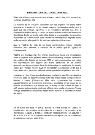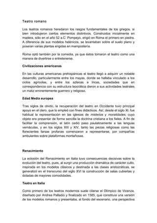 El teatro tiene sus orígenes en los rituales mágicos y ceremonias religiosas de las primeras civilizaciones. Los griegos establecieron los modelos de la tragedia y la comedia en el siglo V a.C. Los romanos heredaron los teatros griegos pero los construyeron de piedra. En la Edad Media, el teatro se utilizó con fines didácticos religiosos y se representó en las iglesias y plazas públicas. El Renacimiento italiano inspiró el desarrollo del teatro moderno con la construcción de salas cubiertas y el