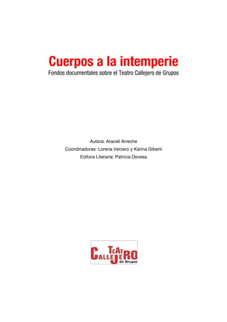 Este documento presenta entrevistas realizadas a varios grupos de teatro callejero y comunitario que participaron en el 2do Encuentro Nacional de Teatro Callejero de Grupos en noviembre de 2003. La primera entrevista es con el grupo Alma Mate, un grupo de teatro comunitario formado en 2002 y dirigido por Alejandro Schaab y Ana Laura Kleiner. El grupo ensaya en la Plaza de los Periodistas en el barrio de Flores.