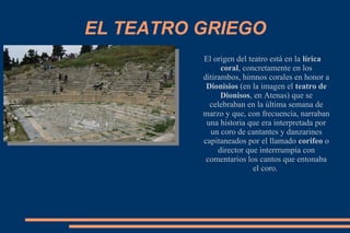 El documento proporciona información sobre el origen y desarrollo del teatro clásico griego y romano. Explica que el teatro griego surgió de los coros dionisíacos y que Thespis introdujo el primer actor. Luego, Esquilo incluyó un segundo actor y Sófocles un tercero. También describe los principales géneros teatrales griegos como la tragedia y la comedia, así como los ciclos temáticos más importantes sobre los que versaban, como los ciclos de Argos y Tebas. Finalmente, resume