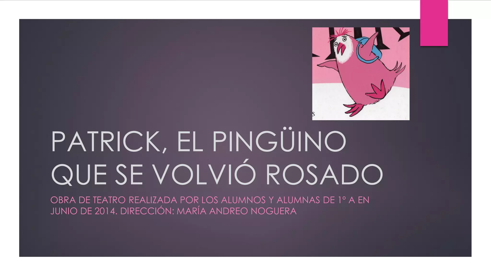 La obra de teatro "Patrick, el pingüino que se volvió rosado" fue realizada por estudiantes de primer grado en junio de 2014 bajo la dirección de María Andreo Noguera. Los estudiantes se esforzaron en memorizar sus líneas y las de sus compañeros a pesar de los nervios iniciales, y finalmente lograron presentar con éxito su montaje teatral con la ayuda de sus familias y maestros.