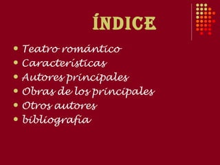 El documento resume las características del teatro romántico, incluyendo su rechazo de las unidades clásicas de tiempo, lugar y acción. Menciona a los principales autores como Ángel de Saavedra cuya obra más famosa fue "Don Álvaro" y José Zorrilla que escribió "Don Juan Tenorio". Finalmente, lista otros autores románticos como Antonio García Gutiérrez y brinda fuentes bibliográficas.