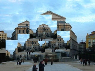 El documento proporciona información sobre el entorno histórico y urbano del Teatro Real de Madrid, incluyendo lugares como la Plaza Mayor, el mercado de San Miguel, la plaza de la Villa y edificios como la Casa de Cisneros y la Torre de los Lujanes. Explica cómo estos lugares han sido usados a lo largo de la historia y su importancia para entender el contexto en el que se encuentra ubicado el Teatro Real.