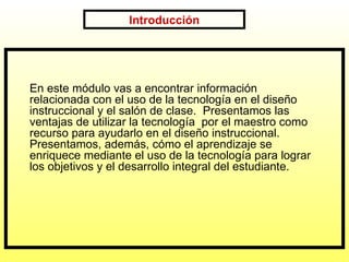 El documento habla sobre el uso de la tecnología en el salón de clases. Explica que la tecnología es una herramienta importante para el diseño instruccional y el aprendizaje estudiantil. También recomienda que los salones de clases se transformen en ambientes que faciliten el pensamiento crítico y la solución de problemas a través del uso de la tecnología.
