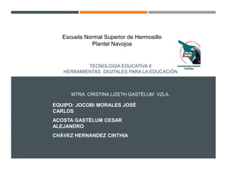 El documento presenta información sobre diversas herramientas digitales para la educación como Vimeo, Blogger, Google Docs, SlideShare, redes sociales, CMS, WordPress, Movie Maker y Flickr. Describe brevemente las características y usos de cada herramienta para apoyar procesos educativos, comunicación y gestión de contenidos en línea.