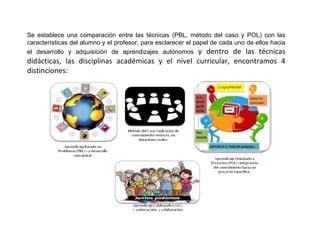 El documento describe las técnicas didácticas utilizadas en el modelo educativo del Tec de Monterrey, incluyendo el aprendizaje colaborativo y el uso de la tecnología como recurso para el aprendizaje. Se comparan técnicas como PBL, el método de caso y POL para esclarecer el papel del alumno y el profesor en el desarrollo de aprendizajes autónomos. Finalmente, se detallan los roles del estudiante y el profesor para promover la adquisición de conocimientos aplicables al context