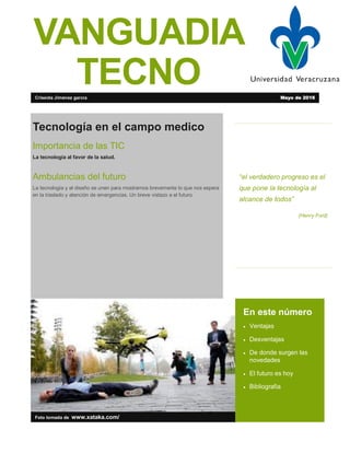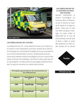 Este documento resume las innovaciones actuales y futuras en ambulancias. Brevemente describe tres tipos principales de ambulancias del futuro: 1) Ambulancias en la Unión Europea con tecnología avanzada y diseños inteligentes que permiten telemedicina y diagnósticos avanzados. 2) Ambulancias que vuelan usando tecnología de drones, ya sea drones regulares o drones a gran escala equipados con camillas. 3) Investigaciones adicionales en ambulancias ligeras impulsadas por la tecnología. El documento concluye resaltando
