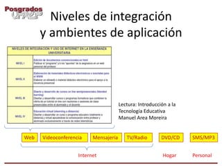 Este documento presenta ejemplos de ambientes y materiales de aprendizaje que pueden utilizarse en la tecnología educativa. Describe brevemente sitios web, blogs, redes sociales, Skype, reproductores DVD y MP3 como posibles ambientes, e incluye ejemplos de materiales en formatos de texto, imagen, presentación, video, audio e interactivos. El propósito es mostrar diversas opciones para integrar la tecnología y proporcionar instrucciones a los estudiantes sobre cómo utilizarlos para su aprendizaje.