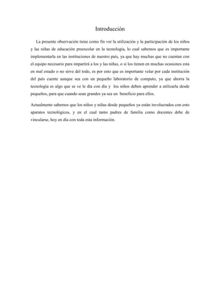 El documento describe una observación realizada en una escuela pública para investigar el uso de la tecnología por parte de los niños. Los niños tenían acceso a computadoras aunque estaban viejas. Usaban programas educativos como Micromundos y juegos interactivos. La maestra también usó la tecnología para contar un cuento y grabar a los niños representándolo. Sin embargo, la escuela carecía de equipo tecnológico en buen estado. El documento propone usar la tecnología para material didáctico, comunicación entre pad