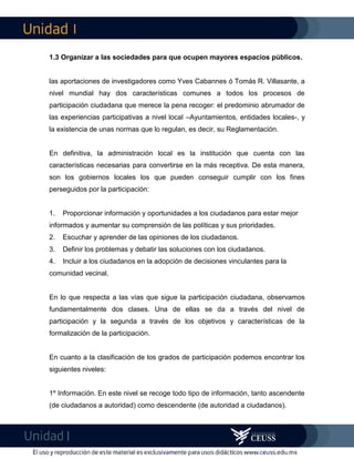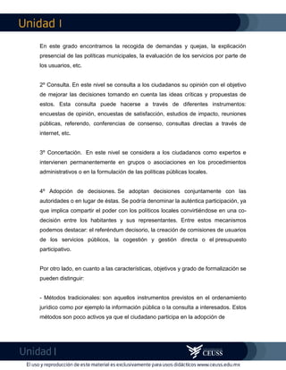 El documento describe diferentes niveles y métodos de participación ciudadana en el gobierno local. Los cuatro niveles de participación son: información, consulta, concertación y adopción de decisiones. Los métodos incluyen tradicionales, del ciudadano-cliente, de democracia directa, foros o consejos, e innovaciones deliberativas. El documento concluye que cada comunidad local debe diseñar su propio proceso participativo utilizando estos diferentes niveles y métodos, así como las nuevas tecnologías.