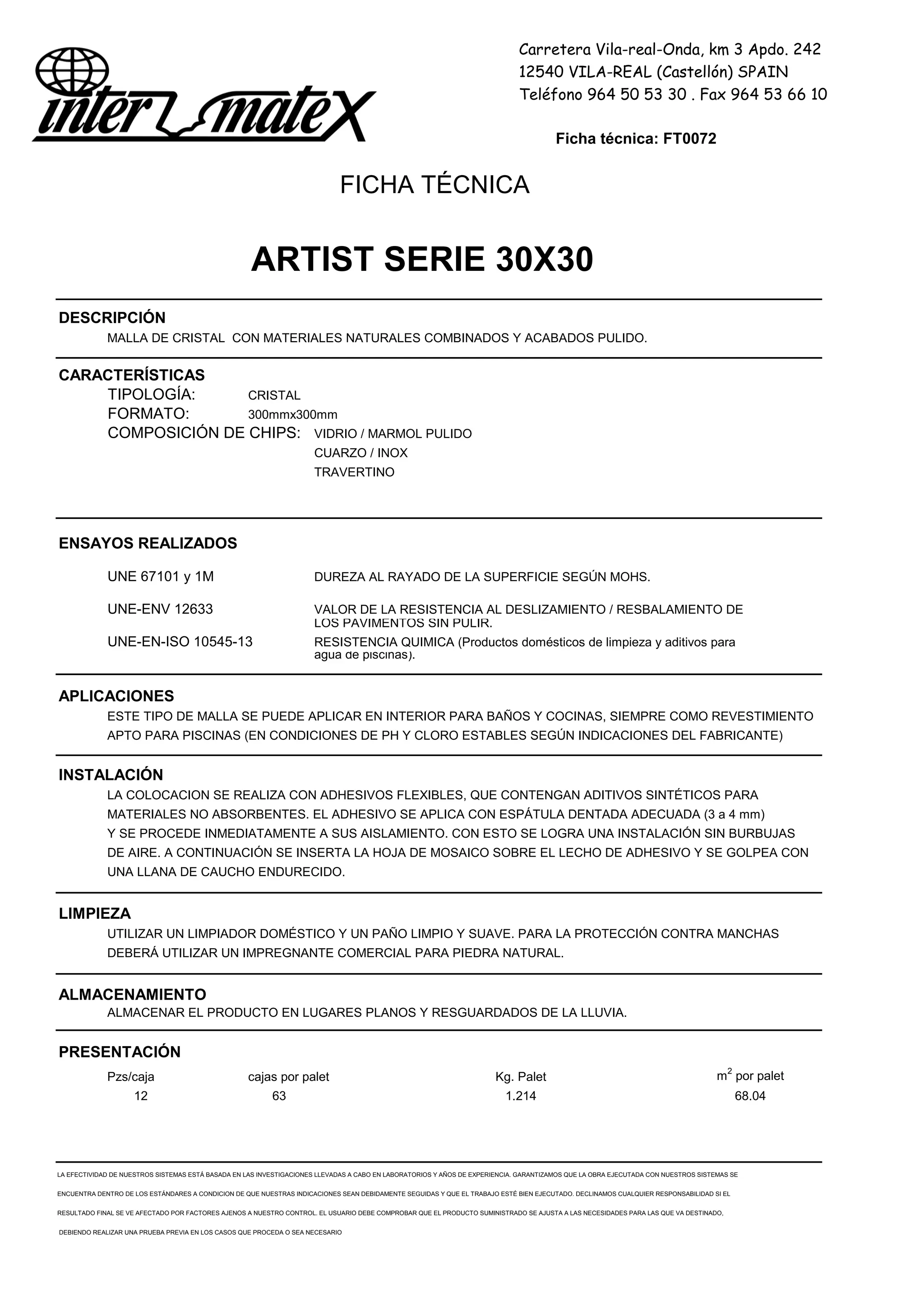 Estos documentos contienen hojas técnicas para varios tipos de mallas de vidrio y mármol de 30x30cm fabricadas por una empresa española. Cada hoja técnica describe los materiales, características, pruebas realizadas, aplicaciones e instrucciones de instalación y limpieza para cada producto.