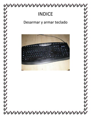 Este documento proporciona instrucciones para desarmar y limpiar un teclado de computadora de manera económica. Explica que primero se deben retirar todos los tornillos del teclado, luego separar la tapa superior para exponer el circuito impreso o placa de plástico. A continuación, se deben retirar los tornillos que sujetan el circuito a las teclas para poder quitar cada una de las teclas individualmente y limpiar debajo de ellas, teniendo cuidado de no perder las tetillas de cada tecla. Una vez limp