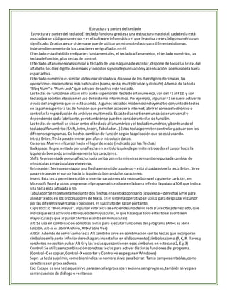 El documento describe las diferentes partes de un teclado, incluyendo el teclado alfanumérico, numérico, teclas de función y de control. Explica que el teclado alfanumérico contiene letras, números y signos de puntuación, mientras que el numérico contiene números y operaciones matemáticas. Las teclas de función y control permiten interactuar con programas mediante atajos y combinaciones de teclas.