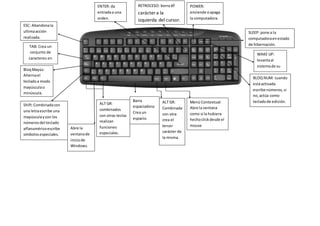 Este documento describe las funciones básicas de un teclado multimedia, incluyendo teclas como ESC, TAB, Mayús, Shift, Windows, ALT GR, Barra espaciadora, Menú contextual, ENTER, RETROCESO, BLOQ NUM, POWER, SLEEP y WAKE UP.