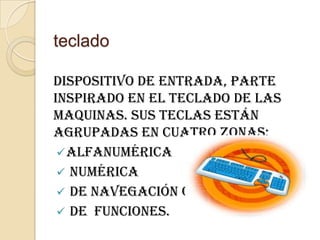 El documento describe las cuatro zonas principales de un teclado: alfanumérica, numérica, de navegación o especial, y de funciones. La zona alfanumérica contiene letras, números y símbolos distribuidos en cinco filas. La zona numérica se activa con la tecla Bloq Num y contiene números para facilitar la digitación de cifras. La zona de funciones incluye teclas F1 a F12 y la zona de navegación o especial contiene teclas como ImprPant, flechas y teclas de ed