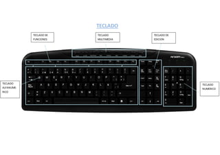 Este documento proporciona una lista de las funciones de las teclas de un teclado de computadora. Describe las funciones básicas de las teclas alfanuméricas, de edición, numéricas y de función. También explica cómo combinar teclas para acceder a funciones adicionales como mayúsculas, borrar caracteres, mover el cursor y realizar acciones como imprimir o apagar la computadora.