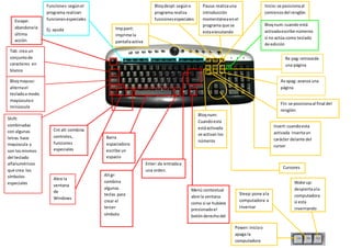 El documento describe las funciones de varias teclas de un teclado multimedia. Algunas teclas como Escape, Tab, Mayús, Shift y Ctrl permiten modificar el modo de entrada o combinarse con otras teclas para ingresar caracteres especiales. Otras teclas como las flechas, Página Adelante, Página Atrás y Enter navegan o ingresan órdenes en programas y páginas web. El teclado también incluye teclas para imprimir, pausar, insertar, posicionarse y encender/apagar la computadora.
