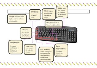 Este documento describe las funciones de varias teclas de un teclado de computadora. Explica que las teclas como Escape, Tab, Bloq Mayús, Shift, Ctrl, Alt, Alt Gr, Windows, Menú Contextual, Pausa Inter, Bloq/Despl, Impr Pant Pet Sis, Inicio, Insert, Re Pág, Av Pág, Fin, Supr, Backspace y Enter tienen funciones específicas como cerrar ventanas, cambiar entre mayúsculas y minúsculas, acceder a menús, pausar el inicio de Windows, bloquear el mouse,