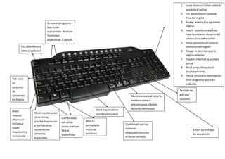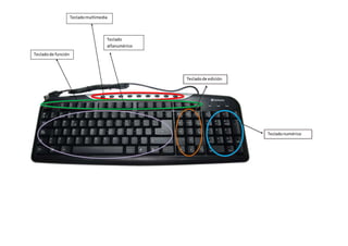 Este documento describe las diferentes partes y funciones de un teclado de computadora. Incluye teclados alfanuméricos, de función, multimedia y de edición. Explica las funciones básicas de teclas como Tab, Mayús, Flechas, Enter, así como las teclas de edición como Supr, Fin, Inicio, entre otras.
