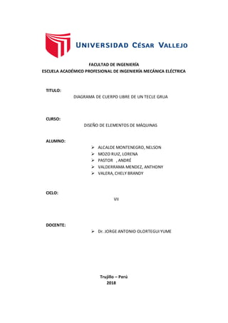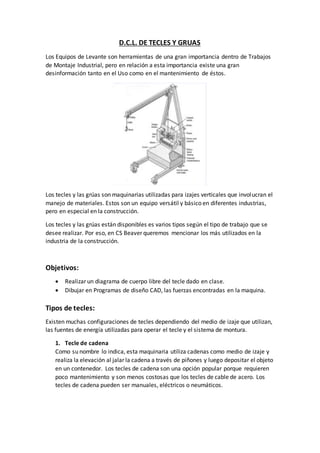 Este documento describe un proyecto de estudiantes de ingeniería mecánica para realizar el diagrama de cuerpo libre de un tecle grúa. Explica brevemente los tipos de tecles y grúas, así como el propósito de un diagrama de cuerpo libre para resolver problemas de dinámica y cinemática. Los estudiantes deben dibujar el diagrama de cuerpo libre del tecle dado y representar las fuerzas identificadas en programas CAD.
