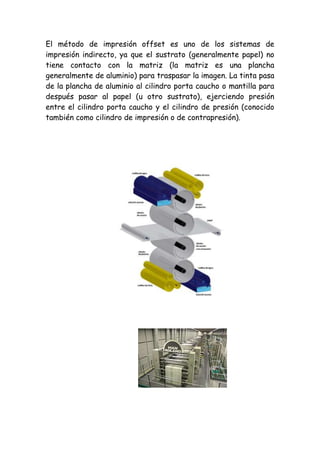 La impresión offset es un método de impresión indirecto donde la imagen se transfiere de una plancha metálica a un cilindro de caucho antes de imprimirse en el papel. Utiliza planchas metálicas, generalmente de aluminio, tratadas químicamente para atraer la tinta solo en las áreas de la imagen. La tinta se transfiere primero a un cilindro de caucho y luego al papel, produciendo impresiones de alta calidad a bajo costo y en grandes volúmenes.
