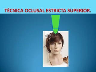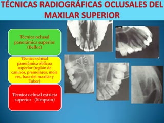 El documento describe diferentes técnicas radiográficas oclusales y sus indicaciones. Incluye técnicas oclusales panorámicas, estrictas y oblicuas tanto para maxilar superior e inferior. Explica la posición del paciente, la película y el rayo central para cada técnica, y sus usos para visualizar dientes incluidos, lesiones, fracturas y otros casos.