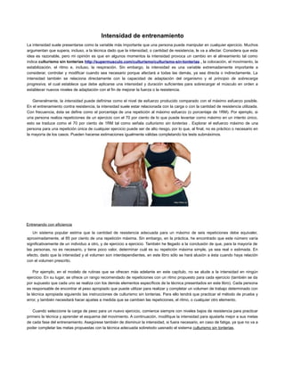 La intensidad de entrenamiento es fundamental y puede influir en aspectos como el alineamiento y la técnica. Se relaciona directamente con la capacidad de adaptación del organismo y el principio de sobrecarga progresiva, donde se debe aplicar una carga suficiente para mejorar la fuerza o resistencia. Para un entrenamiento efectivo, es crucial ajustar la intensidad en función de las metas y realizar pruebas de esfuerzo adecuadas sin arriesgar la técnica.