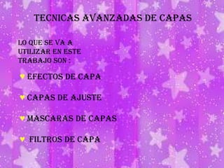 Este documento describe técnicas avanzadas de capas en Photoshop como efectos de capa, máscaras de capas y filtros de capa. Explica cómo crear máscaras de capa a partir de trazados vectoriales como círculos para recortar una capa sobre un fondo. También muestra cómo aplicar estilos de capa como sombra, resplandor y bisel a texto deformado en forma de arco para darle más realce a la imagen.
