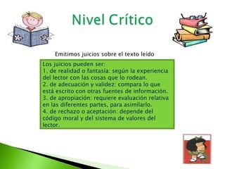 Este documento discute las dimensiones cognitivas y emocionales de la comprensión lectora. Menciona que los lectores más jóvenes a menudo analizan las palabras de manera excesiva. Explica que los lectores forman juicios sobre lo leído y pueden tener respuestas emocionales e identificarse con los personajes. Finalmente, señala que los maestros deben guiar a los estudiantes a comentar el tema, significado de palabras y propósito de la lectura para asegurar la comprensión.