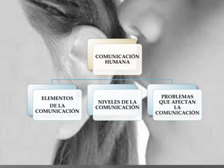 El documento habla sobre los elementos, niveles y problemas de la comunicación humana. Explica que existen dos niveles de lenguaje, popular y erudito, y un nivel técnico intermedio. También describe los roles del transmisor y receptor y posibles problemas como la falta de atención o coherencia en el mensaje. Además, detalla las partes fundamentales del lenguaje y las características de la comunicación escrita.