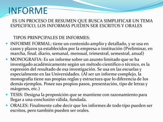 El documento describe los principales tipos de ensayos, informes y resúmenes. Explica que el ensayo aborda temas humanísticos y científicos de manera subjetiva sin una estructura predeterminada. Los informes buscan simplificar temas específicos y pueden ser formales, monografías, tesis u orales. Finalmente, los resúmenes sintetizan el contenido o estructura de un texto de manera breve usando las propias palabras.