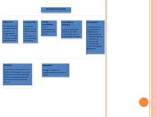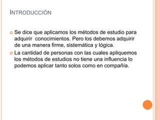 Este documento describe los métodos de estudio y condiciones para un aprendizaje efectivo. Explica que los métodos de estudio deben ser sistemáticos y lógicos, y se pueden aplicar de forma individual o en grupo. Luego detalla cuatro pasos clave para el aprendizaje: 1) organizar el material de estudio, 2) distribuir el tiempo de forma flexible, 3) empezar con las tareas más difíciles, y 4) el rendimiento depende de factores como la alimentación, descanso, lugar de estudio y dedicación. Final