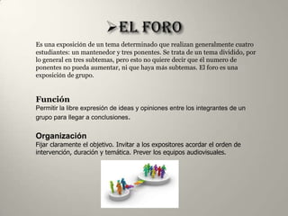 Este documento describe diferentes técnicas grupales como el foro, el debate, la entrevista, el simposio, el panel, las conferencias y la mesa redonda. Cada técnica tiene una función y una organización específica. La función general es permitir la libre expresión de ideas entre un grupo para llegar a conclusiones sobre un tema determinado. La organización implica aspectos como fijar objetivos, invitar expositores, establecer el orden y la duración de las intervenciones.