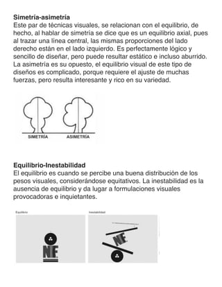 El documento describe 20 pares de técnicas visuales opuestas, incluyendo fragmentación vs unidad, regularidad vs irregularidad, y simplicidad vs complejidad. Estas técnicas se refieren a estrategias para el diseño visual como el uso de elementos, simetría, equilibrio, detalles y más.