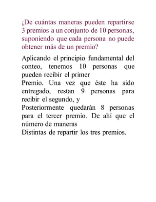 El documento explica los principios fundamentales del conteo y las técnicas para enumerar eventos, incluyendo el principio fundamental del conteo, las permutaciones, las combinaciones y el uso de factoriales. Aplica estas técnicas para resolver problemas como el número de maneras de repartir premios entre personas o crear placas de automóvil.