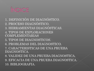 El documento describe el proceso de diagnóstico médico, incluyendo la definición de diagnóstico, las herramientas y tipos de exploraciones utilizadas, y los tipos y características de los diagnósticos. El proceso de diagnóstico implica el análisis y la síntesis de la información obtenida a través de la anamnesis, la exploración física y las pruebas complementarias para identificar la enfermedad del paciente. Un buen diagnóstico debe ser válido, reproducible y seguro.