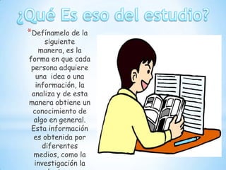 Este documento describe diferentes técnicas de estudio como la lectura, subrayado y resumen. Explica que la lectura implica una pre-lectura, lectura comprensiva y ampliación de vocabulario. El subrayado destaca frases e ideas claves, lo que ayuda a comprender mejor el texto. Un resumen resume las ideas principales de manera breve usando el propio vocabulario. Finalmente, concluye que las técnicas de estudio son herramientas lógicas que mejoran el rendimiento y facilitan la memorización, comprensión y est