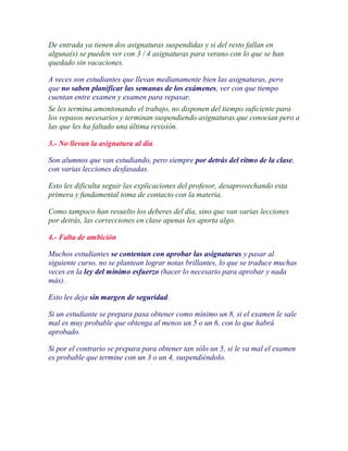 El documento habla sobre los principales problemas que afectan a los estudiantes como la falta de método de estudio y planificación, siendo desorganizados y no teniendo un lugar fijo para estudiar. También menciona que los estudiantes a veces pasan mucho tiempo estudiando pero sienten que no aprovechan bien el tiempo y carecen de un sistema efectivo para estudiar.