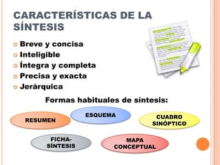 Este documento presenta diferentes técnicas para organizar, estructurar y sintetizar contenidos como el esquema, el resumen, el cuadro sinóptico, la ficha síntesis y el mapa conceptual. Explica las características y ventajas de cada una, así como los pasos para elaborarlas de forma efectiva.