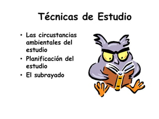 El documento proporciona consejos sobre técnicas de estudio efectivas, incluyendo factores ambientales como un lugar tranquilo y cómodo para estudiar, horarios de estudio flexibles pero consistentes, y la técnica del subrayado para destacar ideas clave y detalles importantes en un texto.