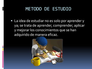 Este documento describe técnicas efectivas para estudiar. Explica que un buen método de estudio requiere orden, distribución adecuada del tiempo, y empezar con las materias más difíciles. Luego detalla siete pasos clave para estudiar: prelectura, notas al margen, lectura comprensiva, subrayado, esquema, resumen y memorización.