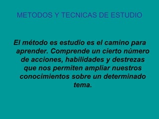 Este documento describe los métodos y técnicas eficaces para estudiar. Explica que el orden, el tiempo dedicado y las condiciones externas como un buen lugar de estudio son elementos clave. También detalla pasos como la prelectura, la lectura comprensiva, el subrayado, y la creación de esquemas y resúmenes. Finalmente, recomienda técnicas como el subrayado, los mentefactos, los resúmenes y los mapas conceptuales para retener la información.