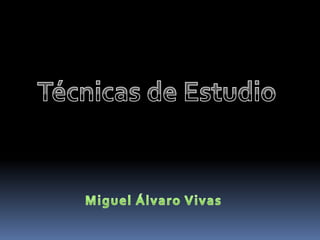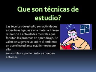 Este documento describe diferentes técnicas de estudio efectivas, incluyendo crear un ambiente tranquilo y bien iluminado para concentrarse, asociar nueva información con conocimientos previos, organizar el material a través de resúmenes y notas, y estudiar en grupos para reforzar la comprensión a través de explicaciones mutuas. También recomienda leer a una velocidad adecuada y con movimientos oculares eficientes para retener la información.