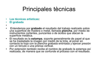 El documento describe diferentes técnicas de grabado artístico como el aguafuerte, aguatinta, grabado a buril y punta seca. El aguafuerte usa ácido para corroer el metal donde se ha eliminado el barniz protector, el aguatinta aplica resina fundida de forma uniforme, la punta seca raya el metal finamente, y el buril hace incisiones profundas. También explica la litografía que dibuja sobre piedra caliza con lápiz graso y transfiere la imagen a papel con prens