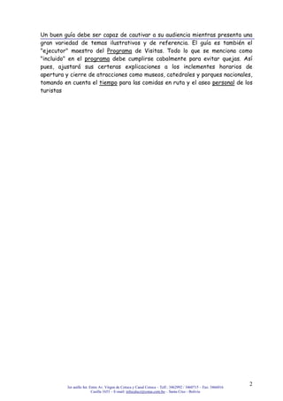 El documento describe las características y funciones de un guía de turismo. Un guía es una persona con amplios conocimientos sobre el patrimonio, historia y servicios de un lugar que acompaña e informa a los turistas durante las visitas. Los guías deben ser puntuales, tener buena comunicación y conocer a profundidad la región y oferta turística para brindar una excelente experiencia a los visitantes.