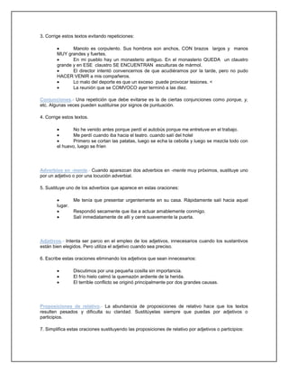 Este documento proporciona una serie de técnicas para mejorar la redacción escrita, como el orden sintáctico correcto, la concordancia, evitar repeticiones, el uso adecuado de conjunciones, adverbios, adjetivos, proposiciones de relativo y precisión léxica. Además, explica errores comunes como el dequeísmo y proporciona ejemplos para practicar cada técnica.