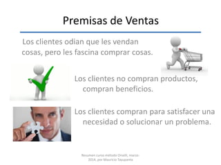 Este documento resume varios conceptos clave de las ventas y el servicio al cliente. Explica que los clientes buscan ser bien atendidos, comprendidos y sentirse importantes. También cubre premisas de ventas como que los clientes compran beneficios para satisfacer necesidades, y los cinco conocimientos básicos de un asesor: producto, mercado, competencia, cultura general y clientes. Además, presenta técnicas para manejar objeciones de clientes y cerrar ventas de manera efectiva.